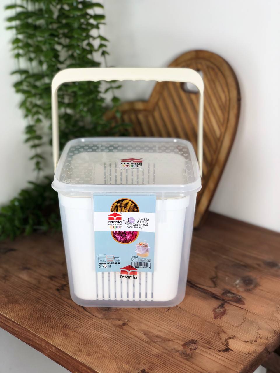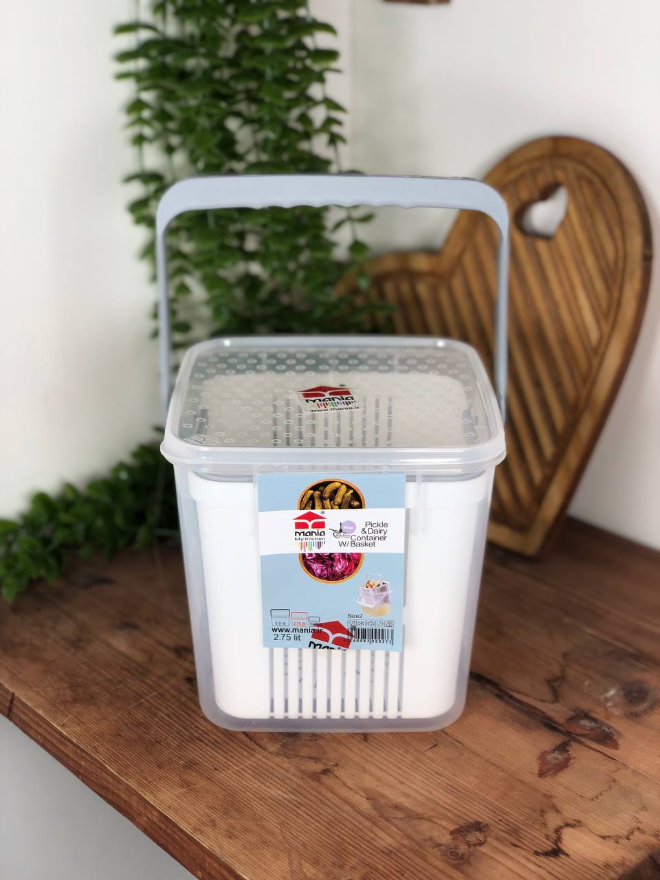 ظرف ترشی و خیارشور مانیا دارای سبد ابکشی جهت جداسازی ترشی یا خیارشور از اب داخلی . گیره وصل شده به ابکش جهت نگهداری راحت تر .